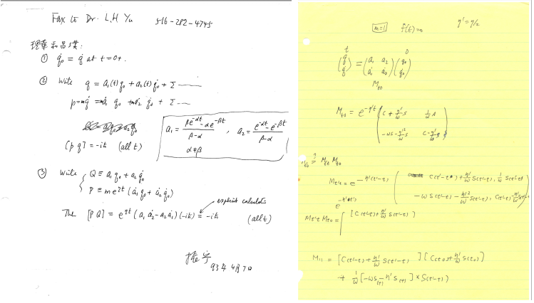 楊振寧(左)和孫昌璞關于宏觀量子系統耗散問題的研究手稿。